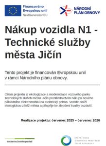 V průběhu letních měsíců letošního roku vyhlásily Technické služby města Jičína výběrové řízení na akci „Nákup nového elektromobilu se sklopnou korbou“. Cílem projektu je ekologizace a modernizace vozového parku Technických služeb města Jičín prostřednictvím nákupu nového nákladního elektromobilu na elektrický pohon. Jedná se o realizaci projektu Životní prostředí ve městech a obcích - Udržitelná městská doprava a mobilita. Celková dotace dosáhla na 455 000,- Kč. Tento projekt je financován Evropskou unií v rámci Národního plánu obnovy. Nový elektromobil byl vysoutěžen za 1.295.701,- Kč bez DPH. Vítěznou firmou se stala společnost ALFA PROFI s.r.o.